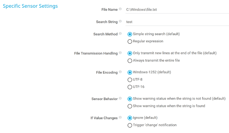 If the file is located on a network device, use the Universal Naming Convention (UNC) path without the server part (only enter share\folder\file.txt). The sensor inherits the server part (\\server\) from the parent device settings. Enter a valid path and file name.
