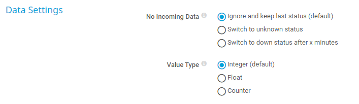 Switch to down status after x minutes: Show the Down status if the sensor does not receive a message within a specific time span. Define the time threshold below.
