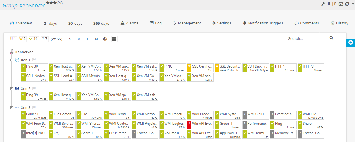 This screenshot shows an example of a XenServer group. There are two devices for XenServer hosts, Xen 1 and Xen 2, that each have a Citrix XenServer Host sensor and several Citrix XenServer Virtual Machine for the particular VMs on this host. Furthermore, the Windows operating system is represented as a dedicated virtualcontrol device that PRTG monitors with several WMI sensors regarding CPU, disk, memory, and network usage.