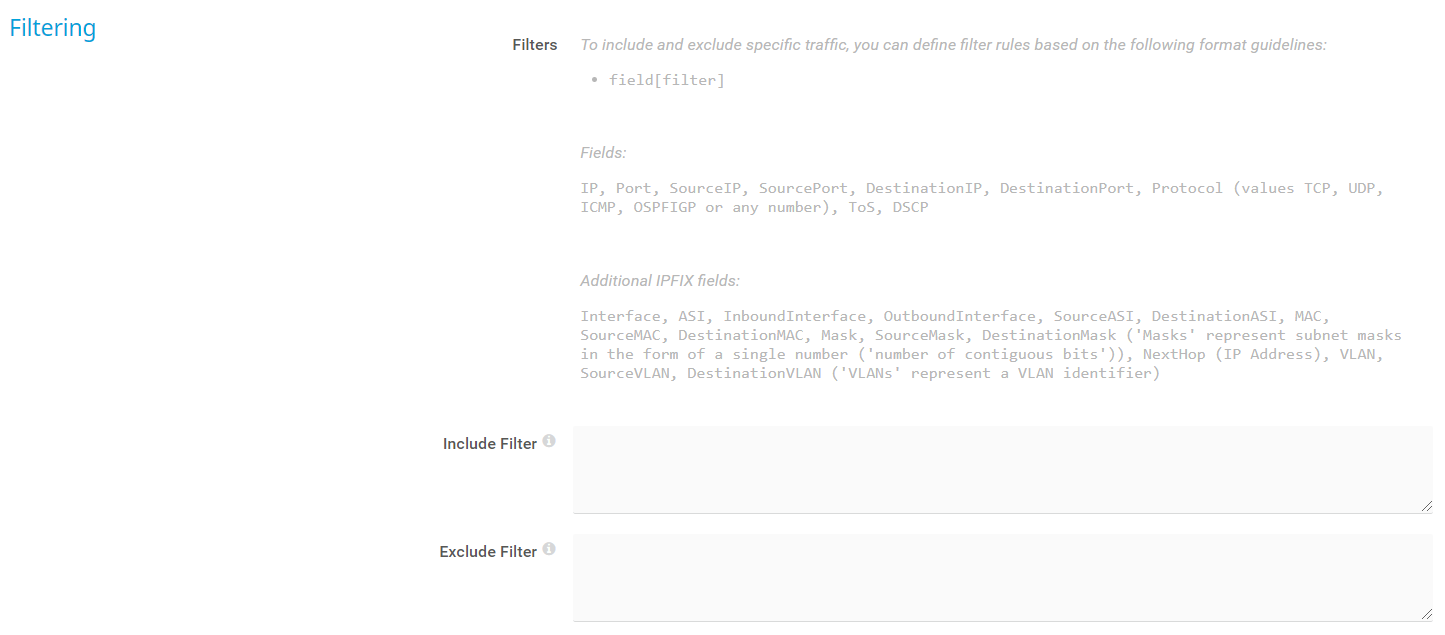 Define if you want to filter any traffic. If you leave this field empty, the sensor includes all traffic. To include specific traffic only, define filters using a special syntax.