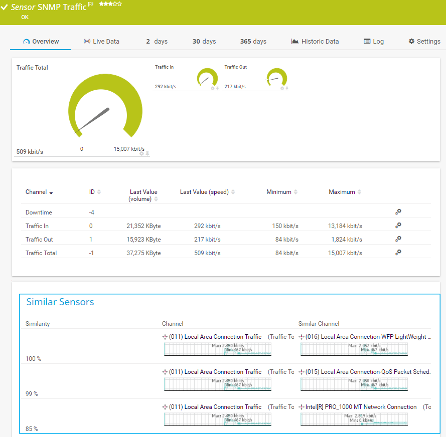 • Via the Overview tab of sensors that includes a Similar Sensors section where PRTG lists channels that show similarities to channels of the selected sensor.